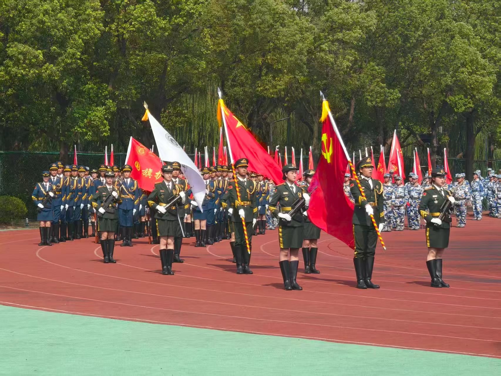 大会在庄严的入场式中拉开帷幕。党旗、国旗、校旗方阵率先出场,校国旗护卫队步伐铿锵、精神抖擞。随后,55面军训连旗迎风招展,象征各连队的集体荣誉与青春信念。机电工程学院“钢铁劲旅”、计算机工程学院“智能方阵”、电子信息工程学院“芯片阵列”等11个学院方阵依次通过主席台,展现出整齐的队列素养与昂扬的精神风貌。
