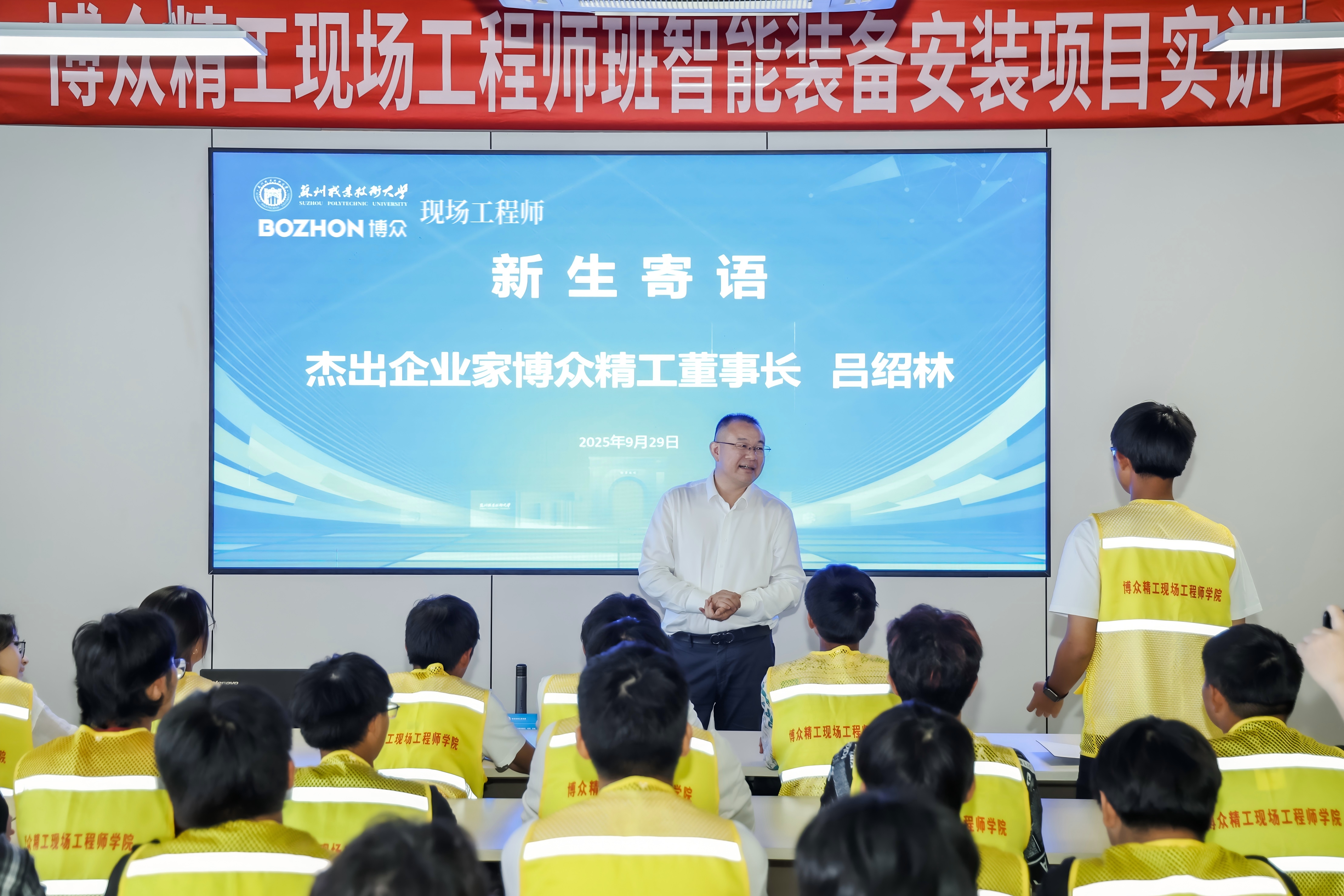活动期间,吕绍林亲临博众现场工程师学院,为2025级现场工程师班新生讲授了内涵深刻的“开学第一课”。他以个人成长与奋斗历程为范本,为同学们带来一堂生动的思政实践课。吕绍林着重指出,“品德为先、为人正直”是职业发展的基石,而“吃苦耐劳、直面困难”则是突破自我、持续成长的核心素养。他勉励全体新生在未来的学习与职业道路上,始终坚守初心,勇于担当。在互动环节,同学们围绕职业规划、专业定位、行业前景及校企合作模式等话题积极提问,吕绍林结合企业实践与行业洞察,给予了详尽而富有指导性的解答。最后,他寄语全体新生:“成功从无捷径,唯有主动拥抱挑战,在选定的领域深耕不辍,方能实现个人价值与行业贡献的双向成就。”